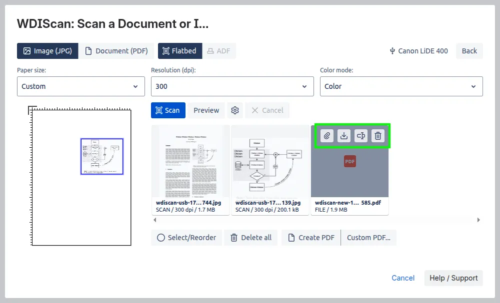You can also “Preview” and select a custom scanning area on the paper diagram. To create a PDF from individual images click “Create PDF” (or “Custom PDF…” for more customization options):